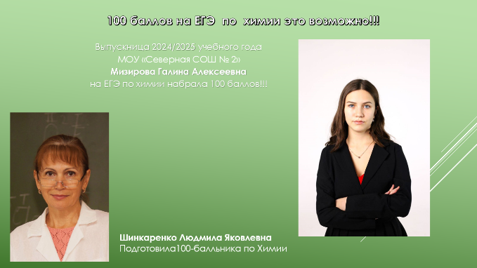 Химия: Мизирова Галина Алексеевна, обучающаяся МОУ «Северная СОШ № 2»