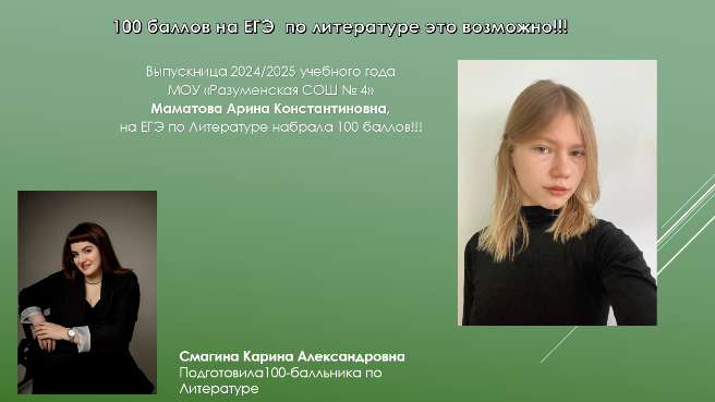 Литература: Маматова Арина Константиновна, обучающаяся МОУ «Разуменская СОШ № 4 "Вектор Успеха".