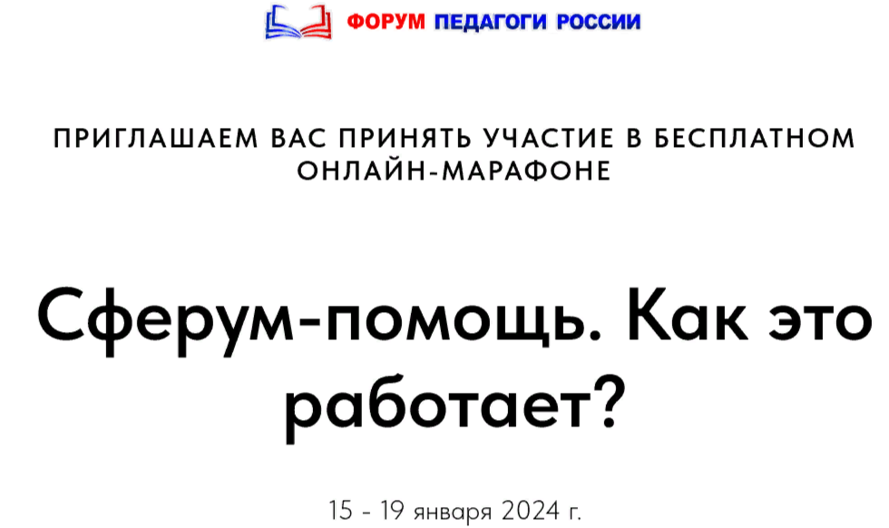С 15 по 19 января 2024 года Форум «Педагоги России» проводит для всех воспитателей и педагогов бесплатный онлайн–марафон «Сферум — помощь. Как это работает?».