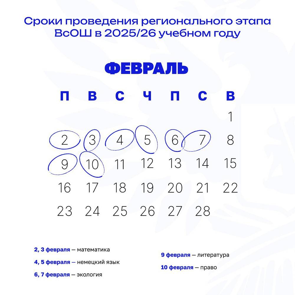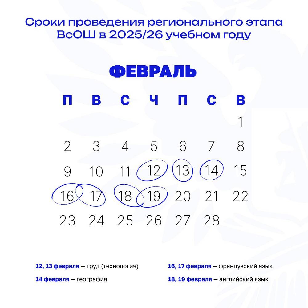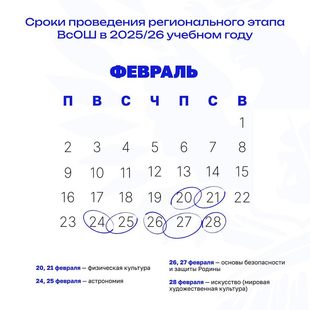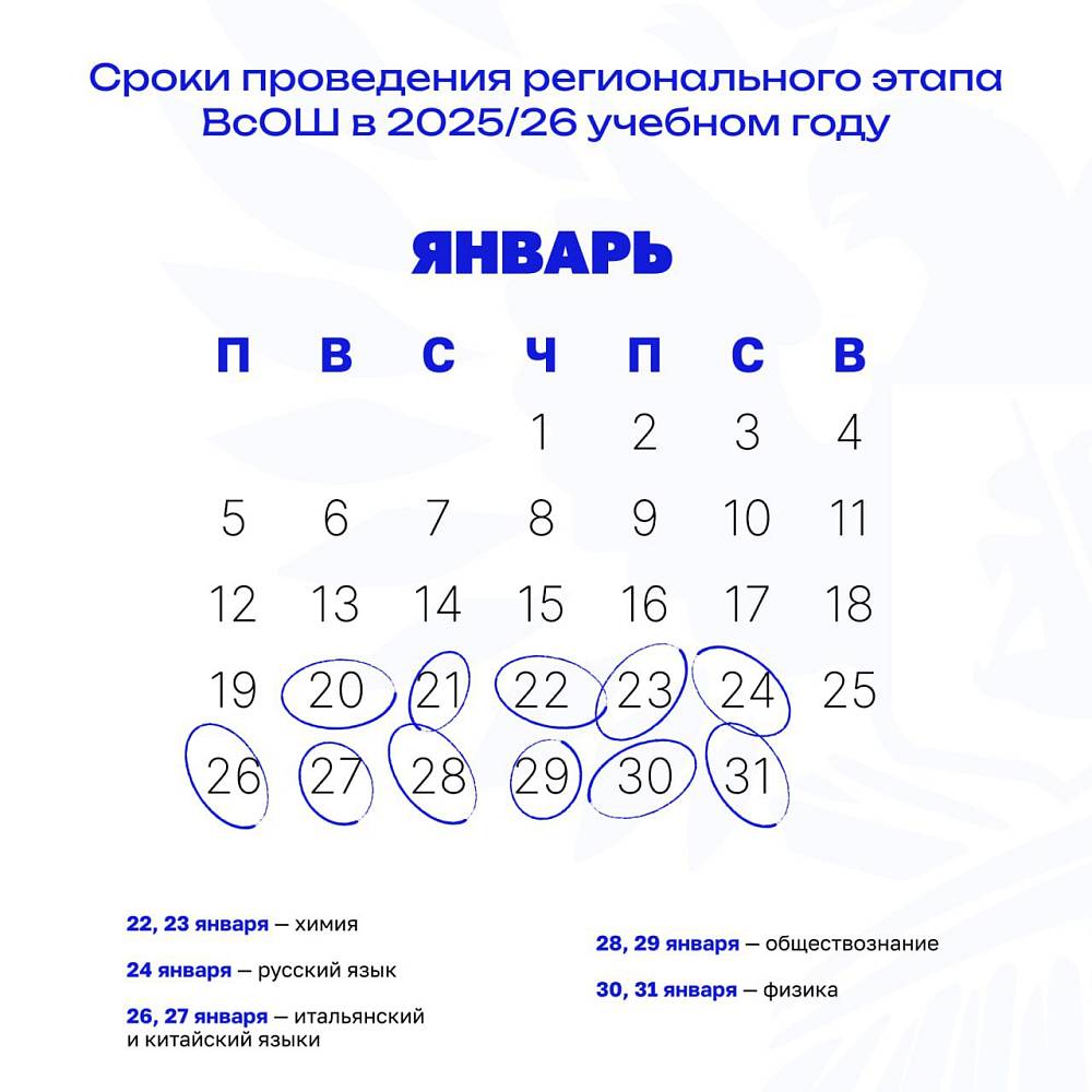 Приказом Министерства просвещения РФ от 15 октября 2025 г. № 748 установлены сроки и график проведения регионального этапа всероссийской олимпиады школьников в 2025/26 учебном году. Он пройдёт по 24 предметам в период с 12 января по 28 февраля 2026 года в 89 субъектах Российской Федерации и на федеральной территории «Сириус». Участниками состязаний станут: